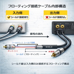 【フローティング構造の配線方式】本製品は、片側のみシールドをグランドに接続し、もう一方は接続しないフローティング構造を採用しており、接続方向は固定せず、お好みに応じてお使いいただける設計です。